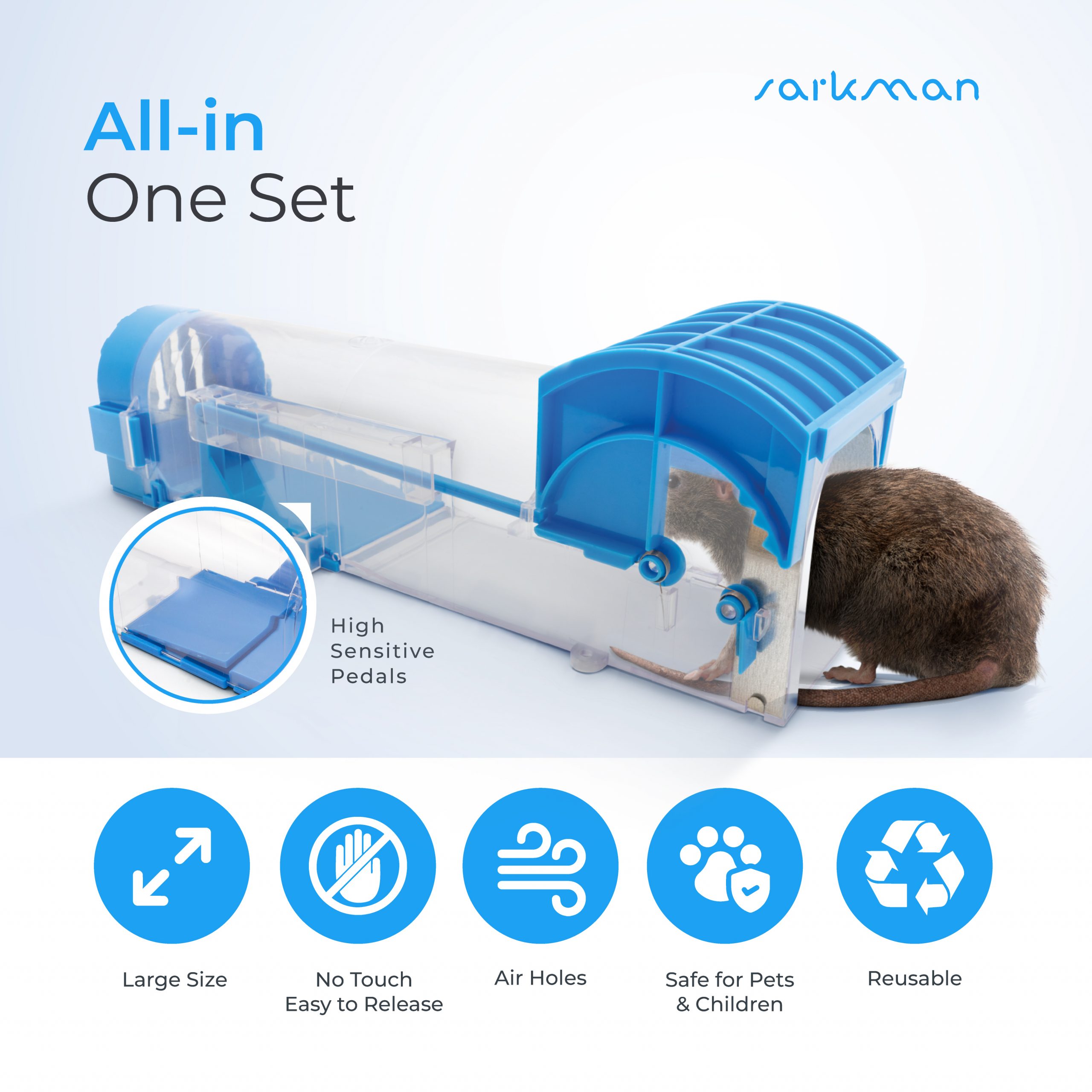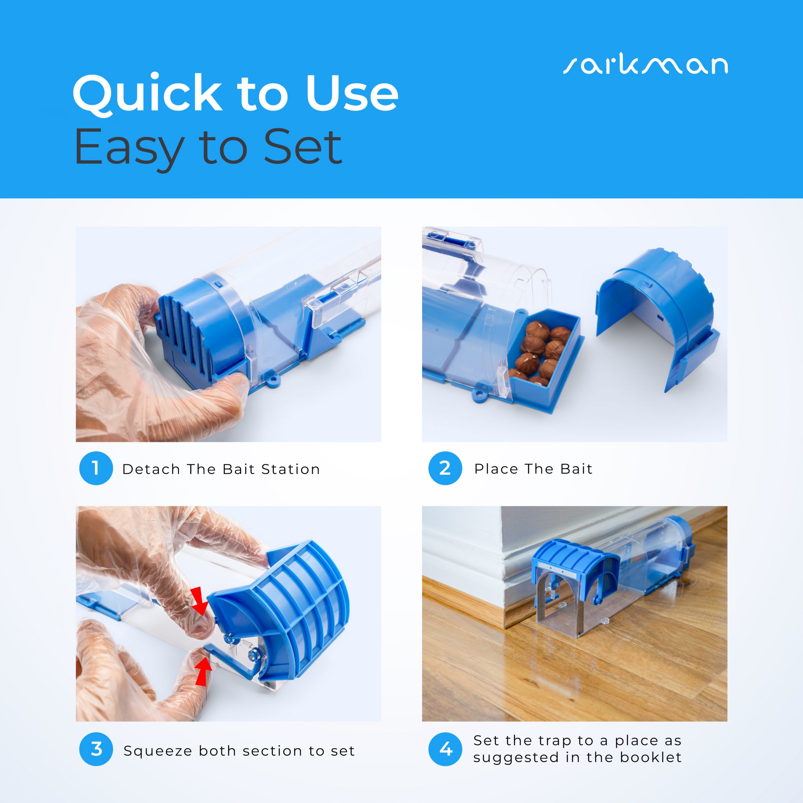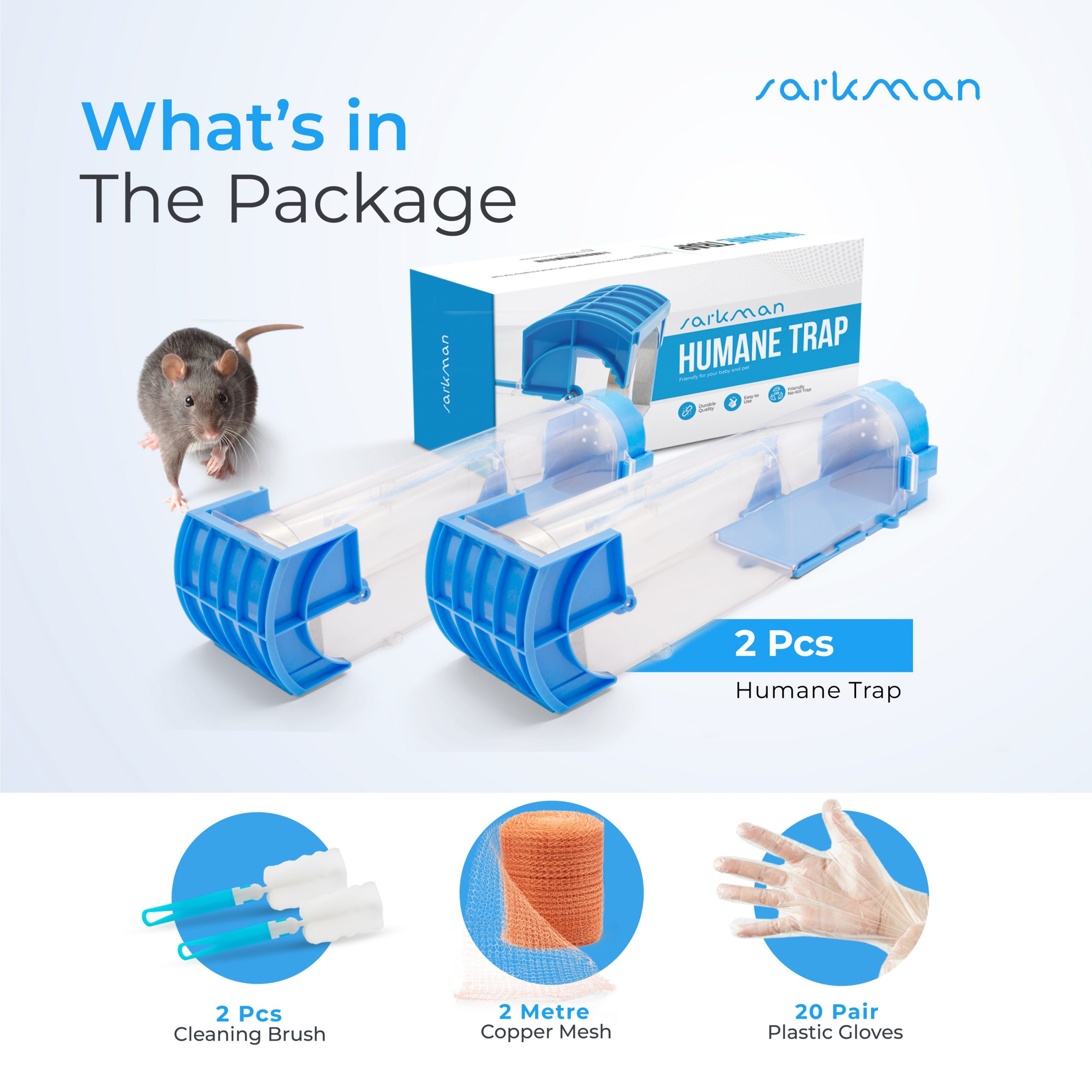 🐭 SUPER EASY TO SET UP AND USE 🐭 sarkman No-killer humane traps are reusable as many times as you will need. Perfect for your house, garden, wooden house, Simply just wash with the extra bonus gloves and the cleaning brushes provided to prepare for reuse. Plentiful ventilation on its door and back door. Fully reusable. sarkman humane no-kill set also comes with super clear instruction booklet to provide you with all the instructions you will need to catch the rodent.