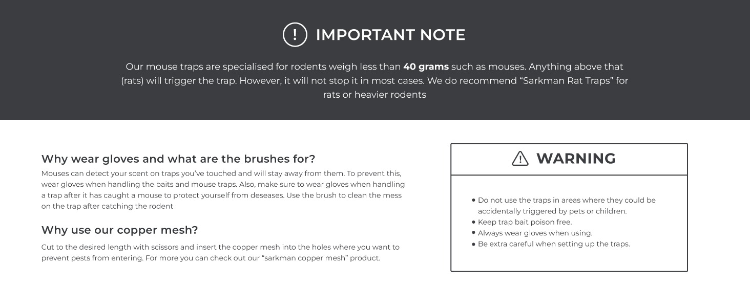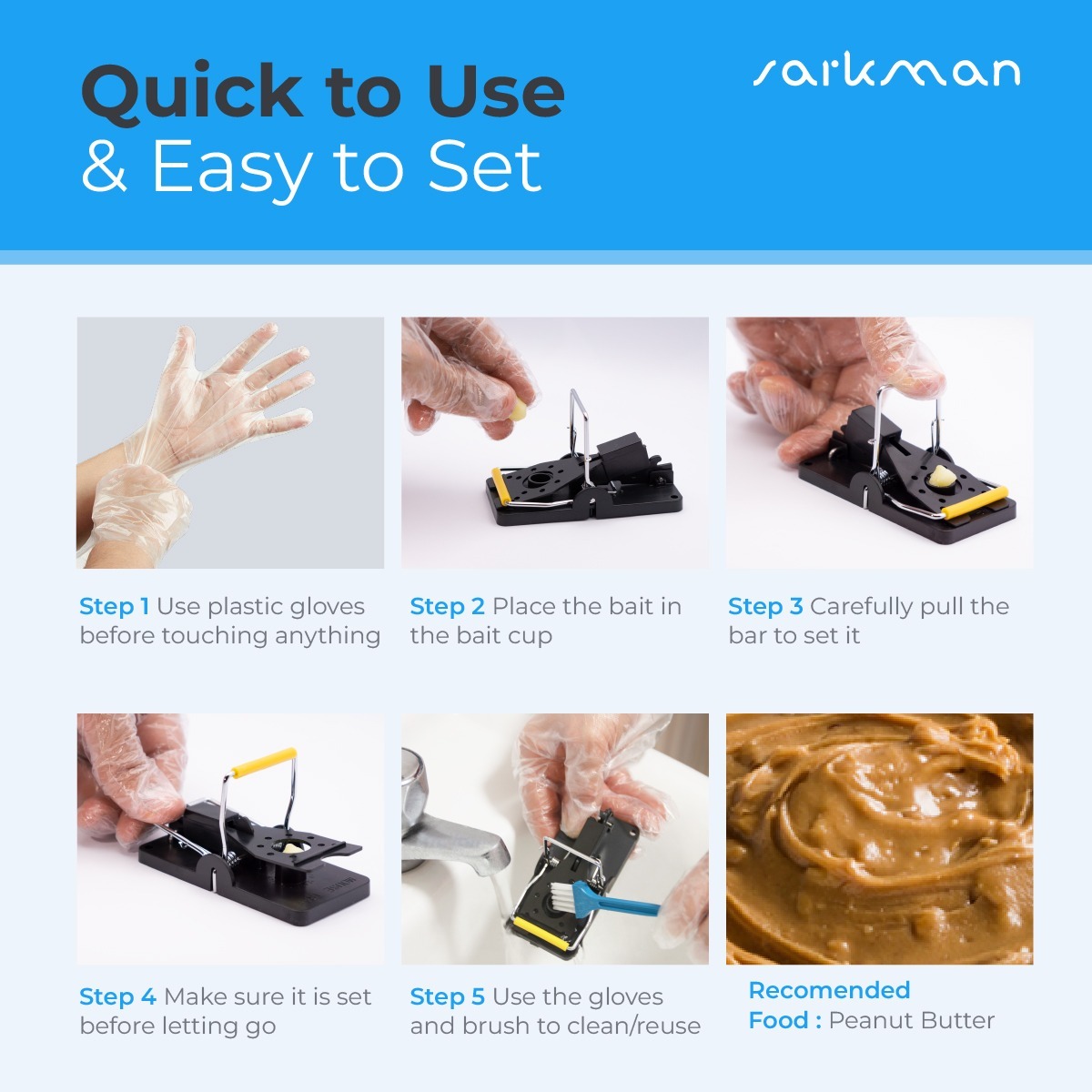 [Bonus Hygiene Accessories] This mouse trap set includes single-use plastic gloves and cleaning brushes for added convenience. The gloves prevent human scent from deterring rodents and keep you safe during setup and disposal, while the brushes make cleaning easy. This bonus ensures a clean and efficient pest control process for your home or garden.